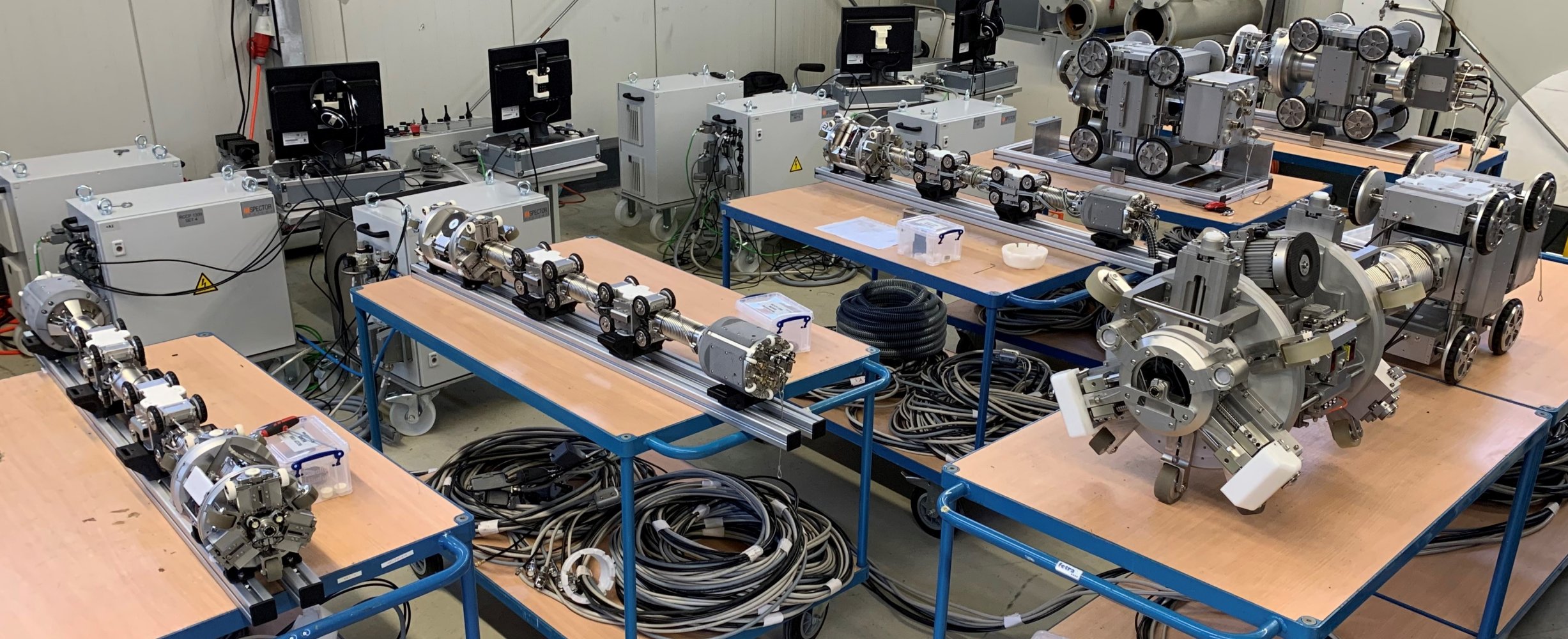 For the 10-inch range alone, several grinding robots and combination robots with extraction and axial laser scanning functions are used. The 27-inch area comprises combination robots, each with triple functions, namely grinding, extraction and axial laser scanning. The 27-inch area also includes gamma robots for radiation testing and additional pipe robots, each equipped with a gripper arm system. These are accompanied by several control systems that are interchangeable, meaning that each control system can be combined with any robot and its application function.